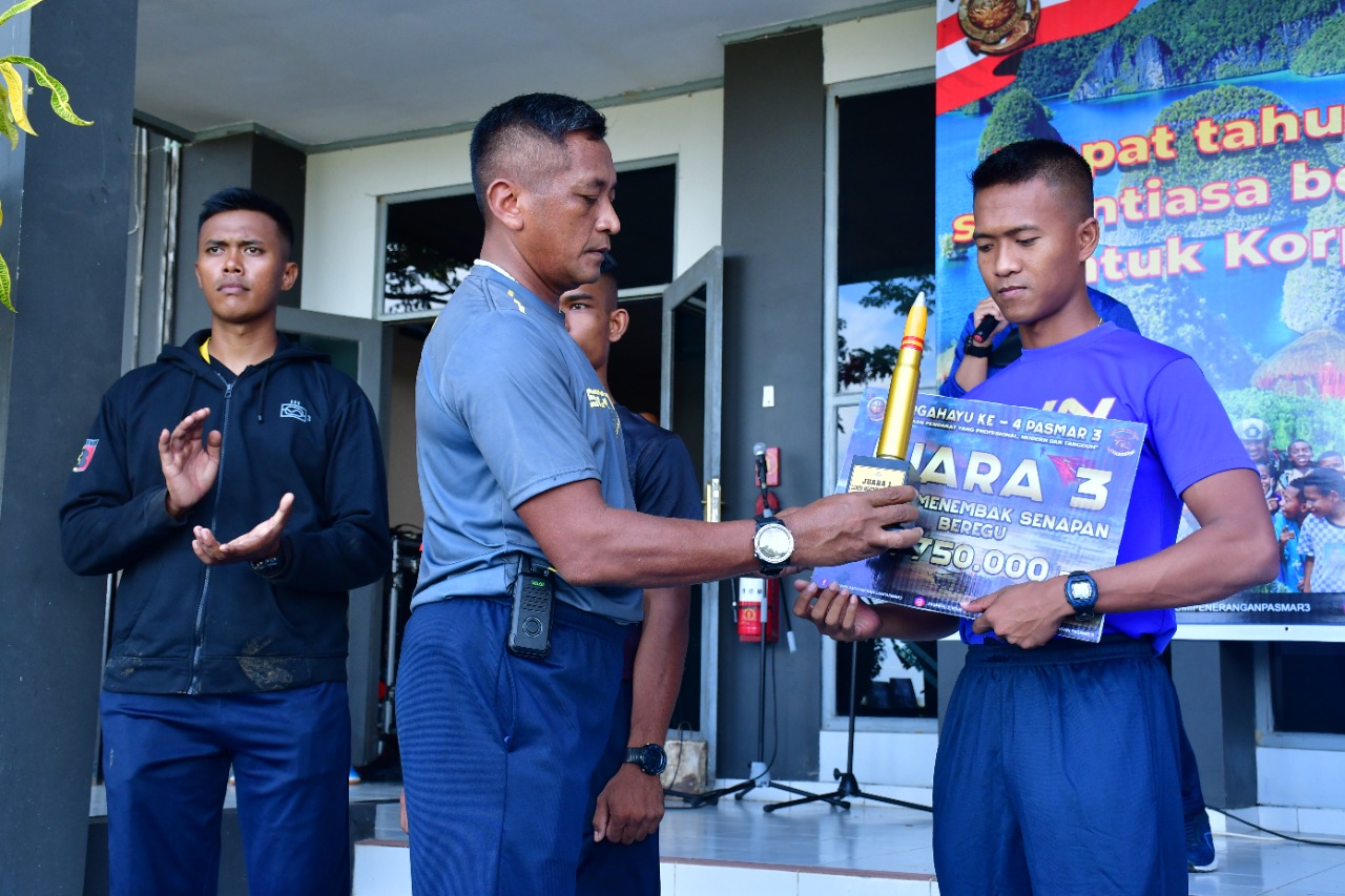 Pada puncak acara yang ditunggu-tunggu oleh seluruh prajurit, panitia perayaan HUT ke-4 Pasmar 3 membagikan grandprize berupa 2 unit sepeda motor. Selanjutnya seluruh prajurit melaksanakan goyang Aster dan goyang Kaka Endah secara massal bersama Ibu-ibu Jalasenastri Korcab Pasmar 3 gabungan Korps Marinir. Tampak kebahagiaan dan sukacita dari raut wajah para prajurit pada saat melaksanakan joget dan diakhiri dengan membawa pulang hadiah-hadiah perlombaan yang dilaksanakan sebelumnya, yakni kejuaraan sepakbola, bulu tangkis, tenis meja, bola volley, lomba tembak senapan, lomba tembak pistol, serta perlombaan antar cabang jalasenastri yaitu lomba memasak khas Papua, membuat minuman buah, tari kreasi dari Timur dan lomba tarik suara. (*)
