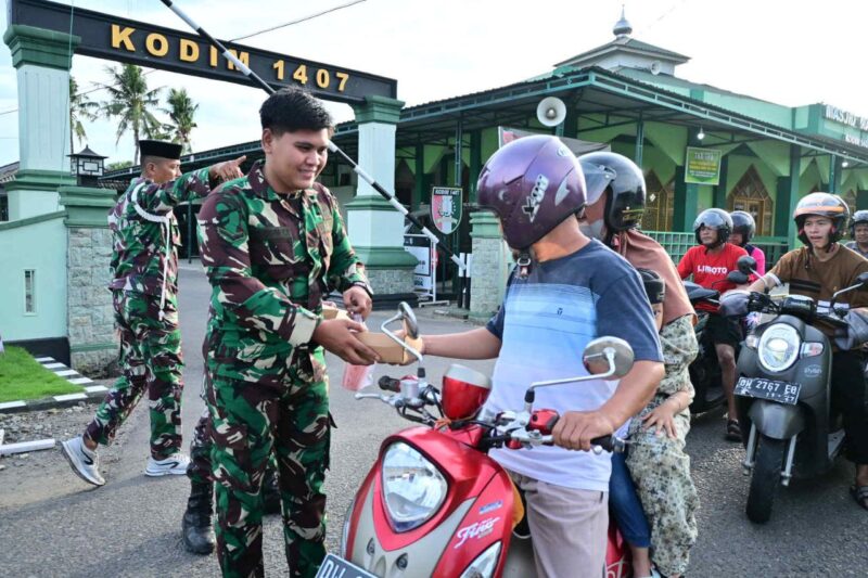 Personel Kodim 1407/Bone secara langsung menyerahkan takjil kepada warga yang melintas dan masyarakat sekitar, sehingga kegiatan berjalan tertib, aman, dan penuh keakraban.