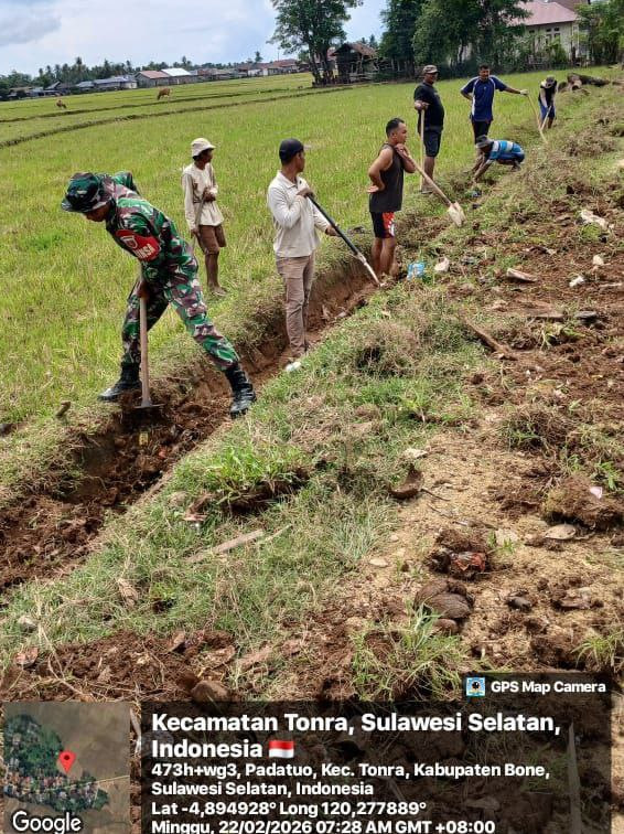 BONE – Koptu Andi Saheran, Babinsa Koramil 1407-16/Tonra, melaksanakan gotong royong penggalian parit di kanan kiri jalan tani yang berada di wilayah binaannya, tepatnya di Kecamatan Tonra, Kabupaten Bone. Minggu siang (22/02/26).