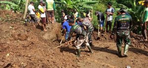 Dibantu masyarakat sekitar dengan menggunakan cangkul dan alat seadanya personel Koramil Lamuru berupaya menyingkirkan tanah yang menutupi jalan utama yang menghubungkan jalan poros Desa Samaenre Kec. Tellulimpoe Kab. Bone ke Desa Tellangkere dan Desa Pujananting Kab. Barru.