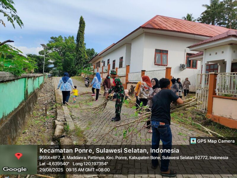 Bone – Anggota Koramil 1407-10/Ponre melaksanakan gotong royong bersama para pegawai Puskesmas dalam rangka pembersihan halaman Puskesmas yang berlokasi di Dusun Lonrong, Desa Pattimpa, Kec. Ponre, Kab. Bone. Sabtu (30/08/25).