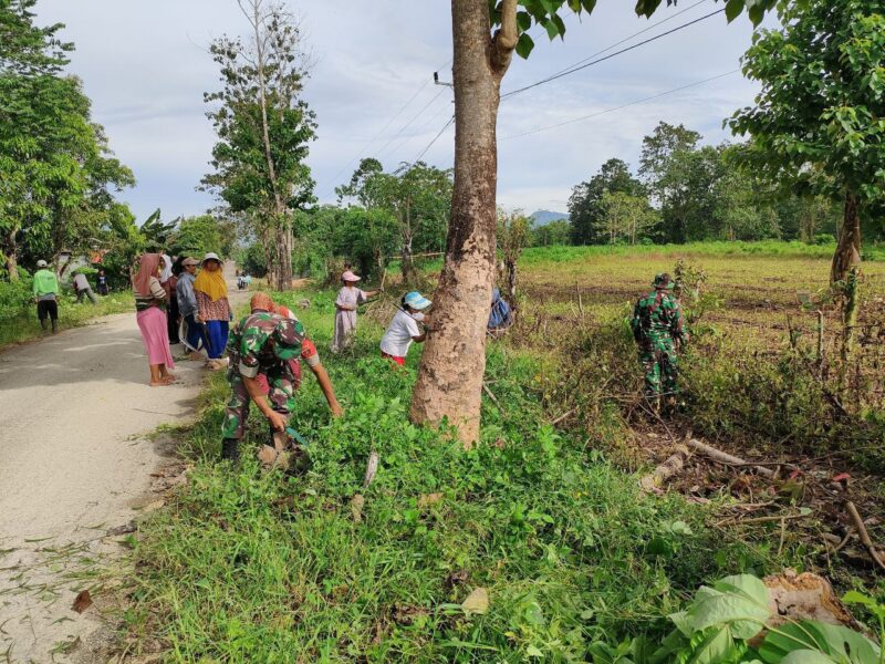 BONE – Anggota Koramil 1407-10/Ponre bersama warga melaksanakan kerja bakti membersihkan ranting pohon dan rumput liar di sepanjang jalan Dusun Lawari, Desa Bolli, Kec. Ponre, Kab. Bone. Jumat (10/10/25).