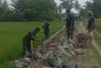 BONE – Babinsa Koramil 1407-01/Ajangale Sertu Ridwan melaksanakan karya bakti membantu warga dalam pembuatan pondasi/talud jalan tani di Desa Lebbae, Kec. Ajangale, Kab. Bone….