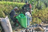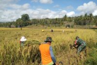 BONE – Serka Abidin Anggota Koramil 08/Lamuru Kodim 1407/Bone terjun langsung ke sawah membantu petani memanen padi di Desa Massenrengpulu, Kec. Lamuru, Kab. Bone….