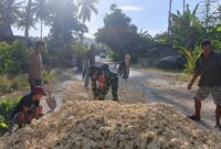 BONE – Pelda M Ridwan Babinsa Koramil 1407-05/Ulaweng-Amali bersama masyarakat melaksanakan gotong royong dalam pembenahan akses jalan aspal yang rusak di Kel. Mampotu, Kec….