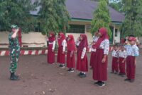 BONE – Babinsa Koramil 1407-14/Libureng Peltu Sulaiman memberikan pelatihan Peraturan Baris-Berbaris (PBB) kepada murid Sekolah Dasar Negeri 181, Kel. Ceppaga, Kec. Libureng, Kab. Bone….