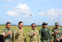 BONE — Dandim 1407/Bone Letkol Inf. Laode Muhammad Idrus turut menyaksikan langsung aksi terjun payung spektakuler yang dilakukan oleh prajurit Batalyon Infanteri 433/Julu Siri…