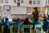BONE – Babinsa Koramil 1407-03/Cenrana, Sertu Fadli Rangga, melaksanakan pembinaan Perlawanan Wilayah (Wanwil) dengan memberikan wawasan kebangsaan (Wasbang) kepada siswa Sekolah Dasar (SD) 78…