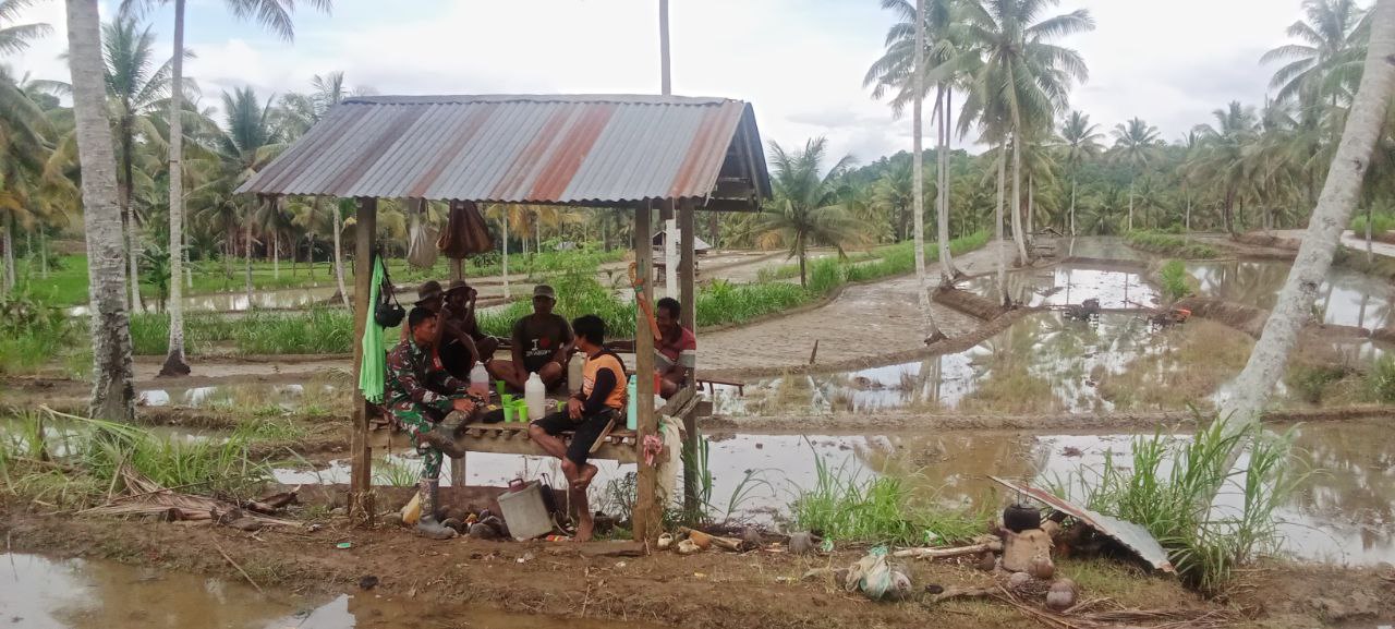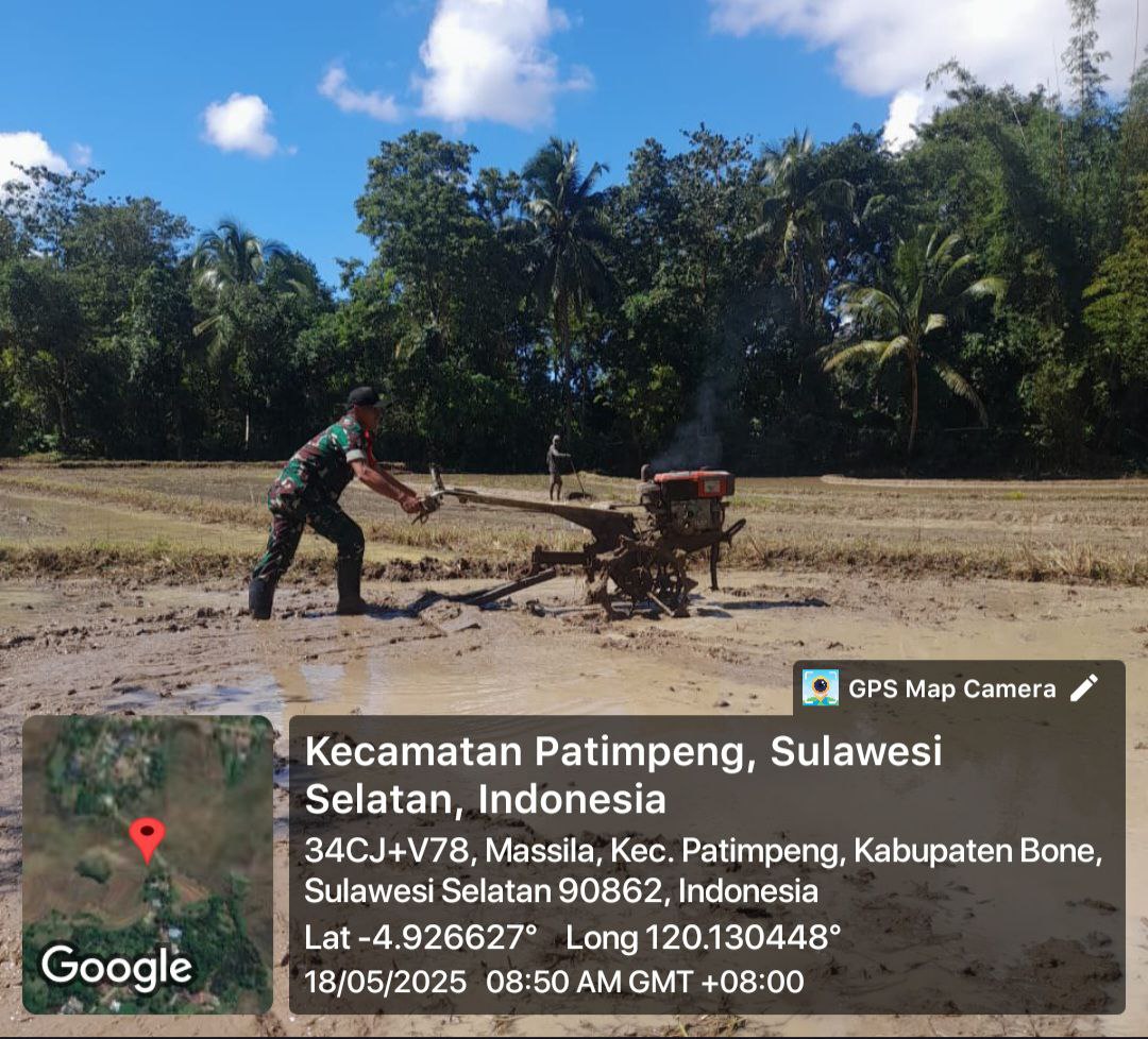 BONE – Babinsa Koramil 05/Ulaweng Kodim 1407/Bone Serda Asri Rais melaksanakan Komunikasi Sosial (Komsos) dengan para petani saat penyiapan lahan untuk musim tanam padi…