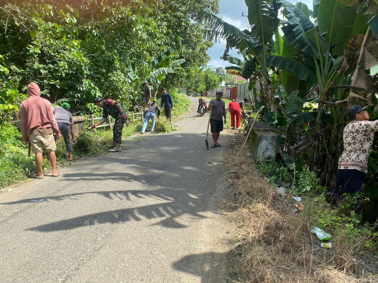 BONE – Babinsa Koramil 06/Awangpone Kodim 1407/Bone Koptu Irfan bersama warga gotong royong membersihkan ruas kiri kanan jalan di desa binaan di Desa Carebbu, Kec. Awangpone, Kab. Bone.