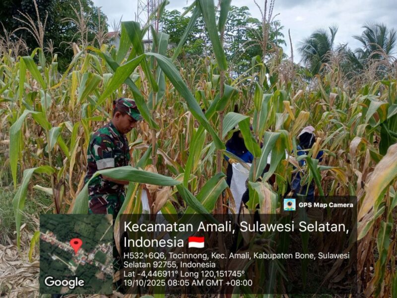 BONE – Babinsa Koramil 1407-05/Ulaweng Serma Supriady melaksanakan pendampingan panen jagung di kebun milik salah satu warga binaannya yang berlokasi di Dusun Coppemelle, Desa Tocinnong, Kecamatan Amali, Kabupaten Bone. Minggu Siang (19/10/25).