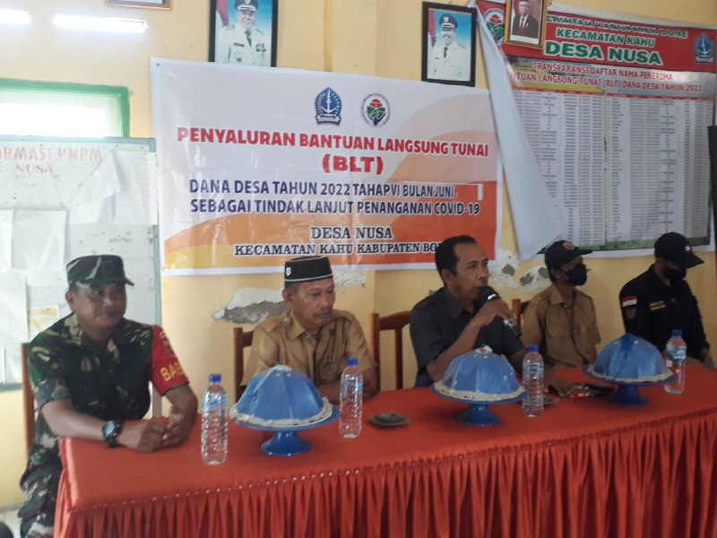 Hadir dalam kegiatan tersebut, Camat Kahu diwakili bapak Andi Ilham, Babinsa Serda Sadaruddin, Kades Nusa Firman.A.Ma, Ketua BPD Ridwan,SE,Para Kepala Dusun Desa Nusa Serta Masyarakat Penerima BLT DD,” tutupnya.(*)