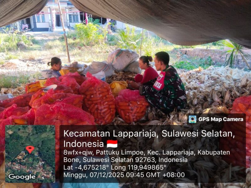 BONE – Babinsa Koramil 1407-09/Lapri Kopka Usman turun langsung membantu petani dalam proses pengupasan jagung hasil panen di Desa Pattuku Limpoe, Kecamatan Lapri, Kabupaten Bone. Minggu Siang (07/12/25).