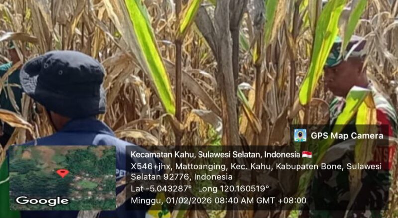 Bone – Babinsa Koramil 1407-19/Kahu Serda Awaluddin, melaksanakan pendampingan program swasembada pangan dengan membantu warga yang sedang melaksanakan panen jagung di Desa Mattoanging, Kecamatan Kahu, Kabupaten Bone. Minggu siang (01/02/26).