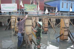“Untuk sasaran pengerjaan hari ini adalah pemasangan rangkaian lantai rumah, dimulai dari pemasangan balok penyanggah lantai, yang bertujuan agar lantai tetap kokoh dan tidak mudah lentur”, jelasnya.