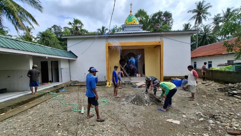 Dalam kegiatan tersebut, Serda Hamsyar bersama warga bahu membahu mengaduk semen, mengangkut material, serta membantu pemasangan pagar masjid.