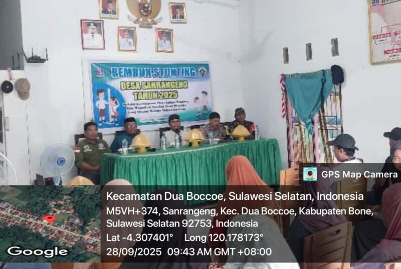 BONE – Babinsa Koramil 1407-02/Dua Boccoe Kopka Adam Talutu hadiri Rembuk Stunting Tahun 2025 yang dilaksanakan bersama aparat pemerintah Desa Sanrangeng, Kecamatan Dua Boccoe, Kabupaten Bone. Minggu siang (28/09/25).