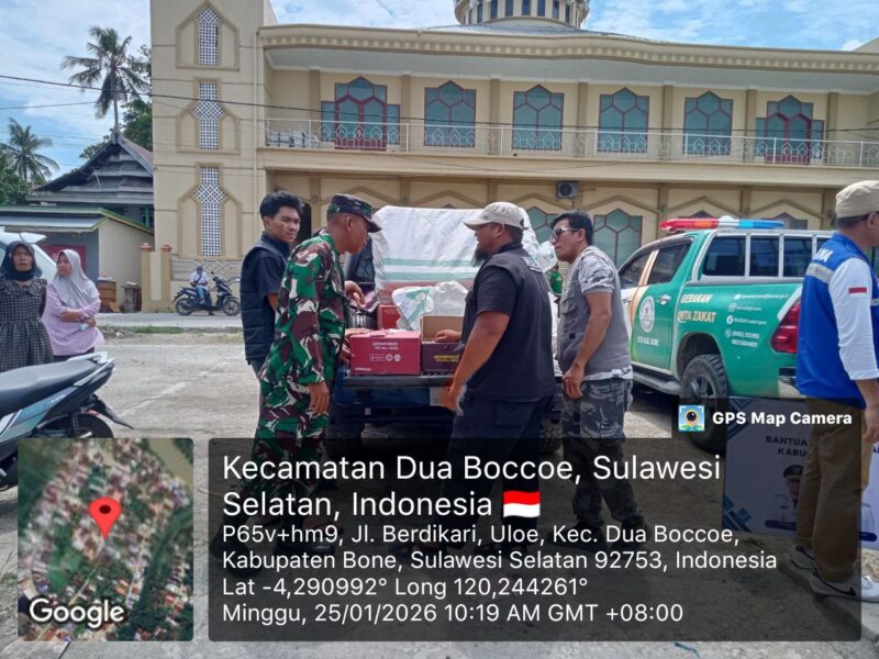 BONE – Babinsa Koramil 1407-02/Dua Boccoe melaksanakan pendampingan kepada Badan Amil Zakat Nasional (Baznas) dalam kegiatan penyaluran bantuan kepada warga korban kebakaran di Desa Uloe, Kecamatan Dua Boccoe, Kabupaten Bone. Minggu Siang (25/01/26).