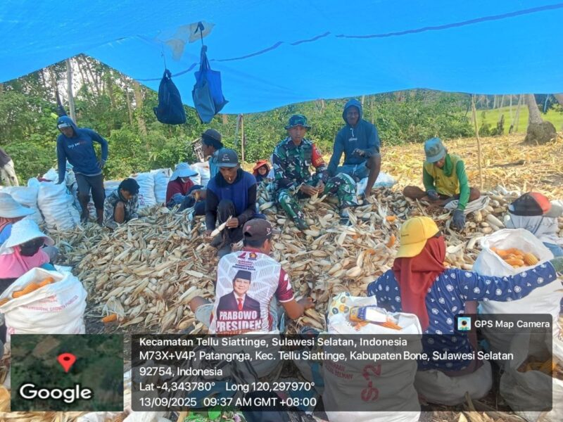 Bone – Babinsa Koramil 04/Tellusiatinge Kodim 1407/Bone, Serda Samsul Alam, membantu warga binaannya mengupas jagung hasil panen di Desa Patangnga, Kecamatan Tellusiatinge, Kabupaten Bone. Sabtu (13/09/2025).