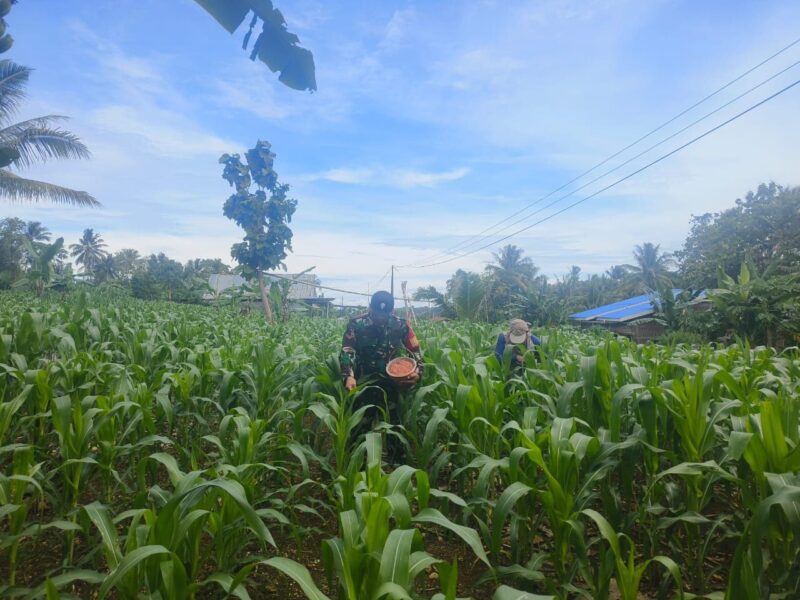 Bone – Babinsa Koramil 1407-05/Ulaweng Kopda Wahyudin dampingi petani dalam proses pemupukan tanaman jagung di Dusun Tobenteng, Desa Lili Riattang, Kec. Ulaweng, Kab. Bone. Sabtu (03/01/26).
