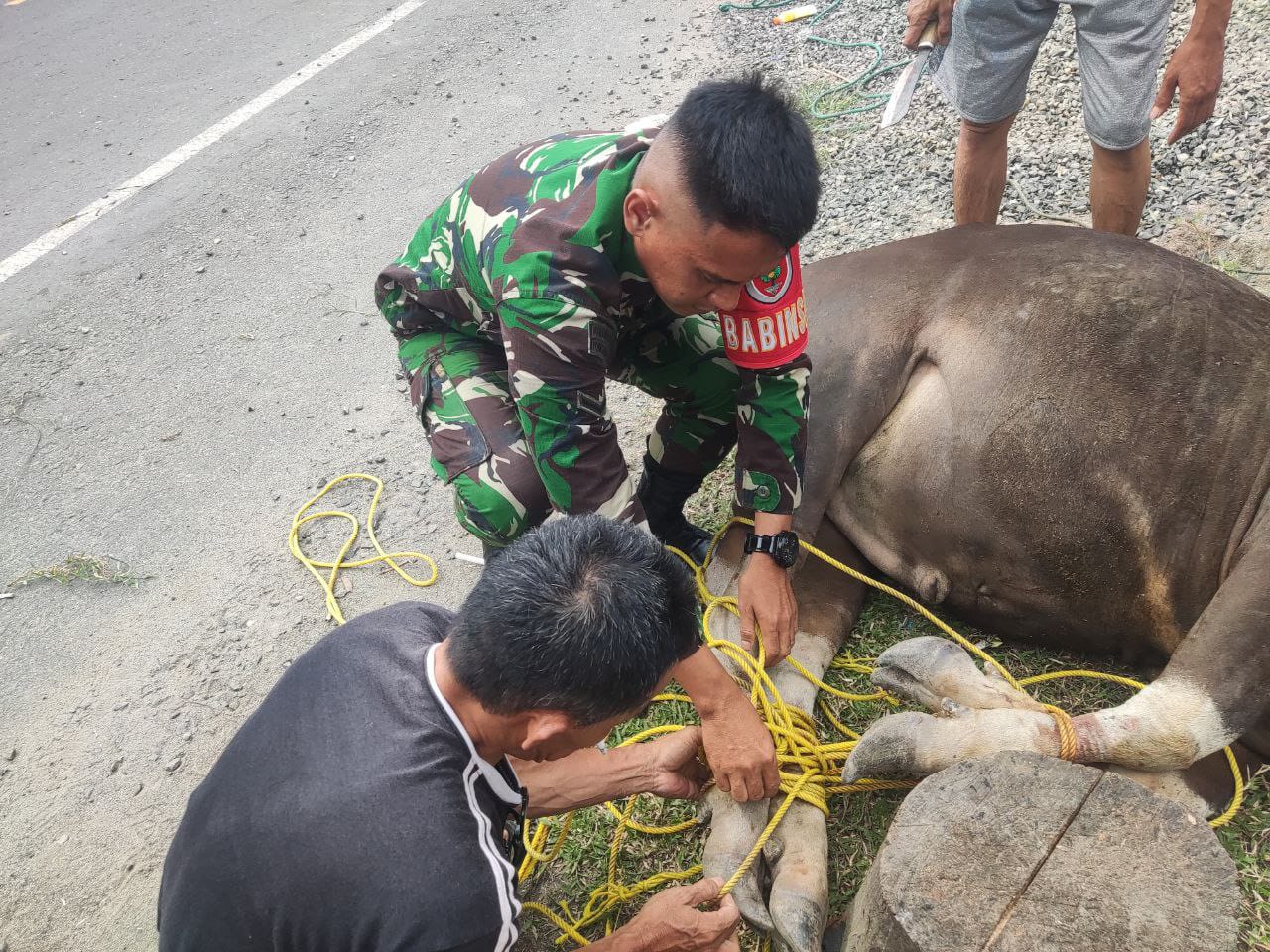 Serda Ardi Kurniawan menambahkan bahwa salah satu tugas Babinsa adalah ikut serta berperan aktif dalam setiap kegiatan masyarakat di Desa binaannya, termasuk memberikan pendampingan dan membantu pelaksanaan penyembelihan hewan kurban hingga pembagian daging secara langsung kepada warga secara tertib.