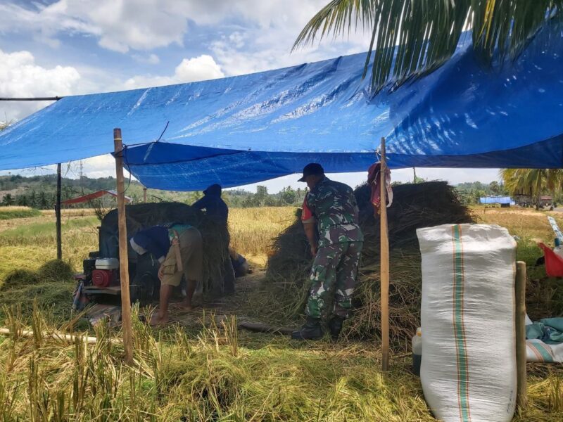 BONE – Serka Amir Hamsah Babinsa Koramil 1407-08/Lamuru terjun langsung ke sawah untuk membantu petani dalam memanen padi di areal persawahan Desa Barakkae, Kec. Lamuru, Kab. Bone. Kamis (23/10/25).