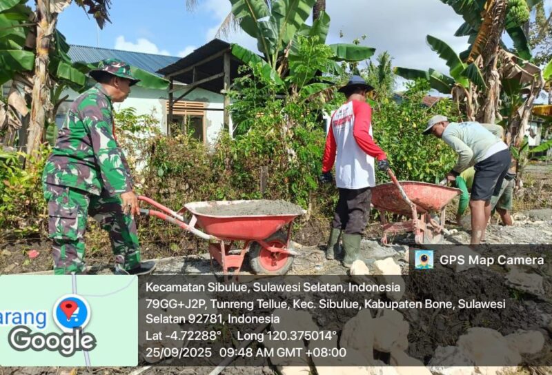 BONE – Bintara Pembina Desa (Babinsa) Koramil 13/Sibulue Kodim 1407/Bone Serka H. Hasanuddin bersama warga masyarakat melaksanakan kerja bakti membuat saluran air di Desa Tunreng Tellue, Kec. Sibulue, Kab. Bone. Kamis Siang (25/09/25).