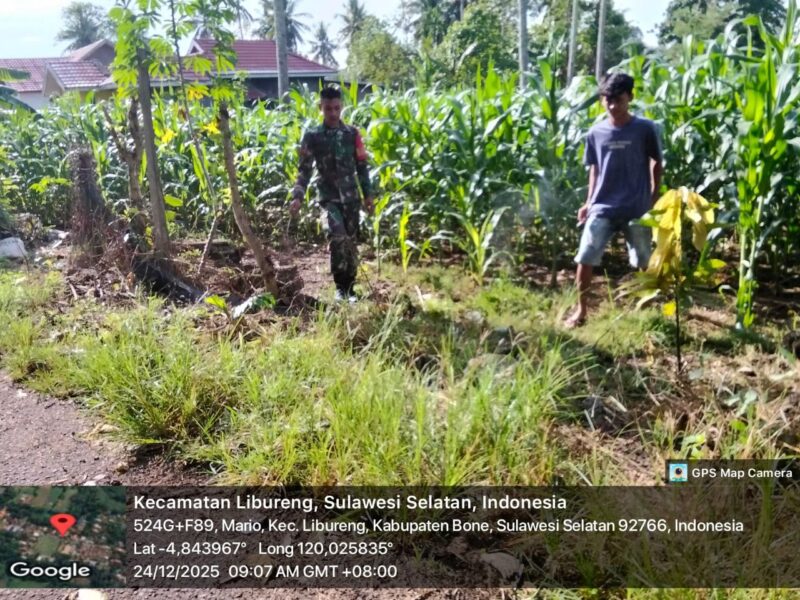 Bone – Pratu Hatta, Babinsa Koramil 14/Libureng, Kodim 1407/Bone, mendampingi petani di wilayah binaan untuk meninjau pertumbuhan tanaman jagung di Desa Mario, Kecamatan Libureng, Kabupaten Bone. Rabu siang (24/12/2025).
