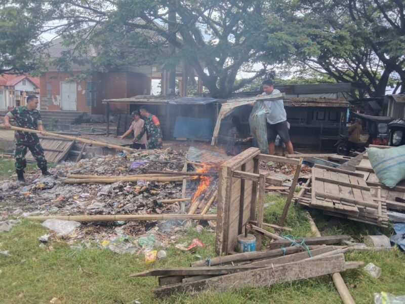 Babinsa bersama warga bahu-membahu membersihkan tumpukan sampah yang selama ini menjadi salah satu penyebab pencemaran lingkungan dan gangguan estetika pasar.
