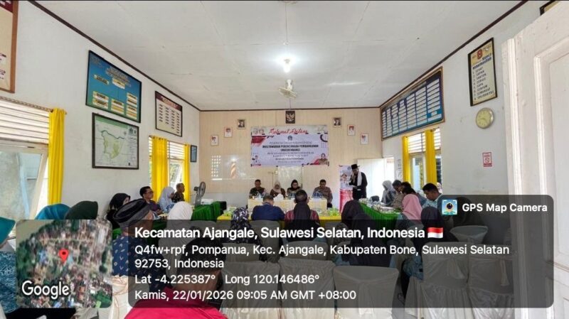 BONE — Sertu Idris, Babinsa Koramil 1407-01/Ajangale, mengikuti kegiatan Musyawarah Perencanaan Pembangunan (Musrenbang) yang dilaksanakan di Kantor Kelurahan Pompanua, Kecamatan Ajangale, Kabupaten Bone. Kamis Siang (22/01/26).
