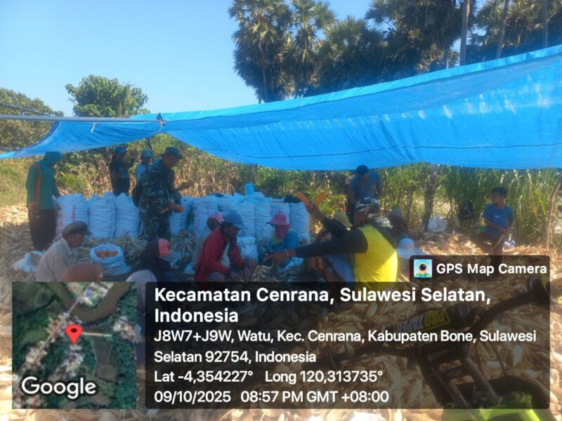 BONE – Babinsa Koramil 1407-03/Cenrana Serda Sabir melaksanakan pendampingan panen jagung bersama para petani di Dusun III Awangpasareng, Desa Watu, Kecamatan Cenrana, Kabupaten Bone. Kamis siang (09/10/25).