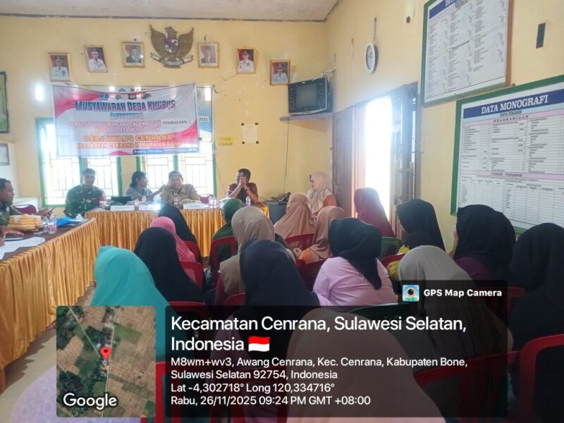 BONE – Babinsa Koramil 1407-03/Cenrana, Serda Muhammad Sabir menghadiri undangan Musyawarah Desa (Musdes) Penetapan Anggaran Pendapatan dan Belanja Desa (APBDes) Tahun 2025 yang berlangsung di Kantor Desa Awang Cenrana, Kecamatan Cenrana, Kabupaten Bone. Rabu Siang (26/11/25).