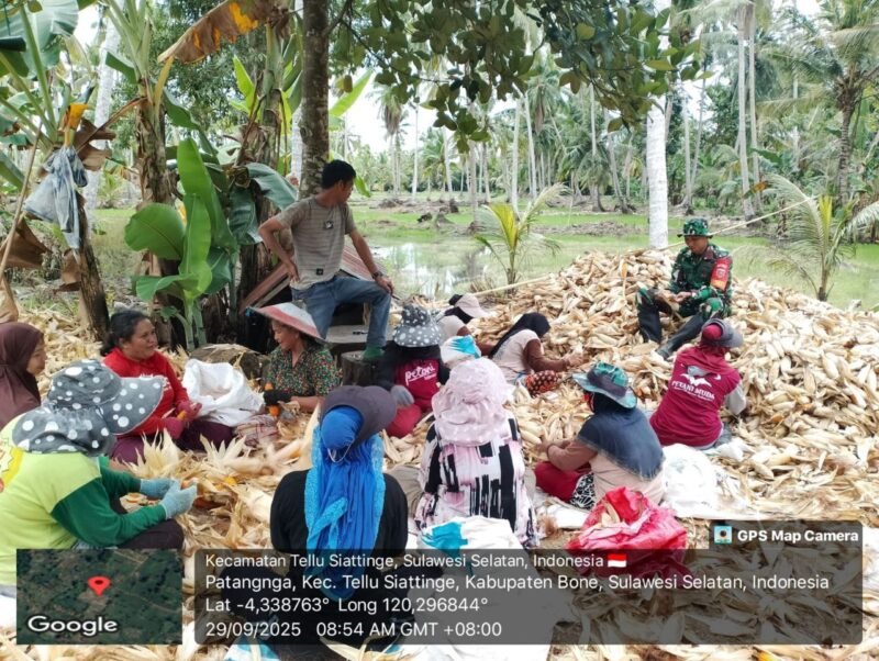 BONE – Babinsa Koramil 1407-04/Tellusiatinge Serda Samsul Alam membantu warga binaannya mengupas jagung hasil panen di Desa Patangnga, Kec. Tellusiatinge, Kab. Bone. Senin siang (29/09/25).