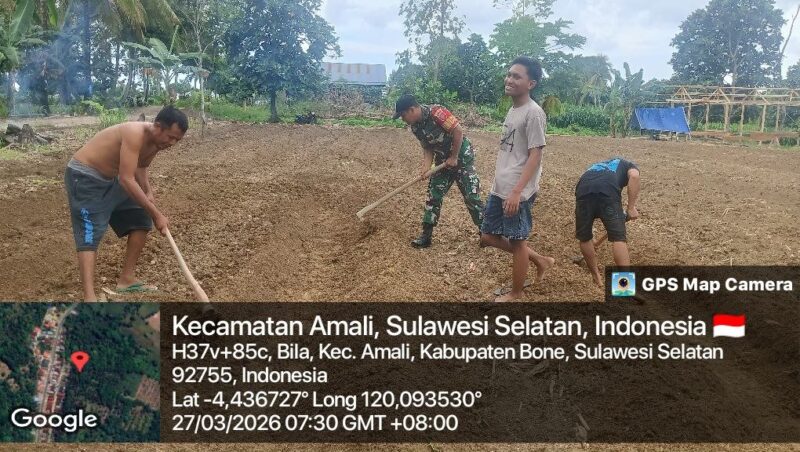 BONE – Pelda Ridwan, Babinsa Koramil 1407-05/Ulaweng-Amali, melaksanakan kegiatan pendampingan kepada warga dalam mengolah lahan pertanian di Desa Bila, Kecamatan Amali, Kabupaten Bone, Jumat siang (27/03/26).