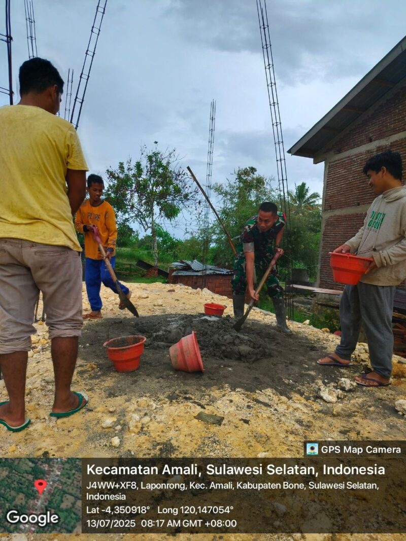BONE – Wujud nyata kepedulian TNI terhadap masyarakat kembali ditunjukkan oleh Babinsa Koramil 1407-05/Ulaweng, Serda Sumardi, Babinsa Desa Laponrong, melaksanakan kegiatan membantu warga dalam pembangunan rumah di Dusun Lepompakke, Desa Laponrong, Kecamatan Amali, Kabupaten Bone, pada Minggu (13/07/2025).