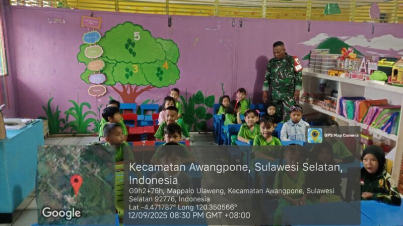 BONE – Babinsa Koramil 1407-06/Awangpone melaksanakan kegiatan pembinaan perlawanan wilayah (Wanwil) bertempat di Taman Kanak-Kanak Dusun Werori Desa Mappalo Ulaweng, Kecamatan Awangpone, Kabupaten Bone. Jumat (12/09/2025).