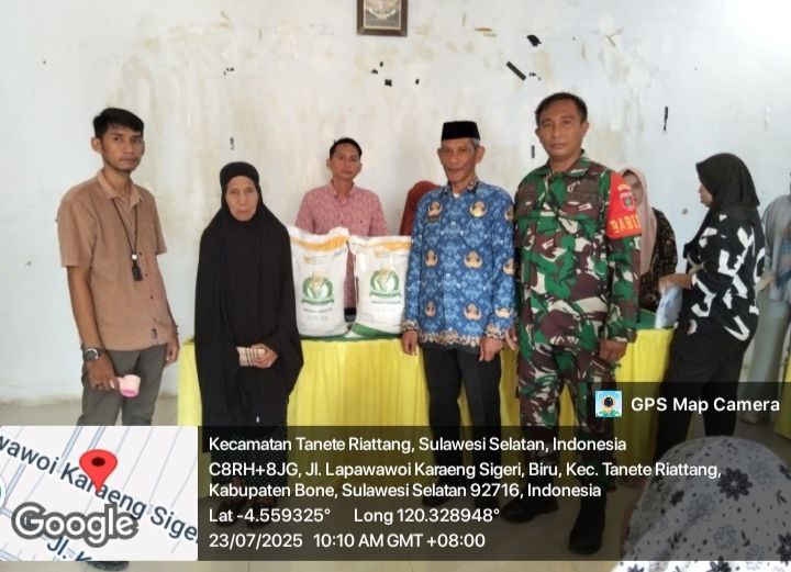 BONE – Dalam rangka mendukung upaya ketahanan pangan masyarakat dan program pemerintah, Sertu Sainuddin Babinsa Koramil 1407-07/Tanete Riattang melaksanakan pendampingan kegiatan penyaluran Cadangan Beras Pemerintah( CBP), di Kel. Biru, Kec. Tanete Riattang, Kab. Bone. Rabu ( 23/07/2025).