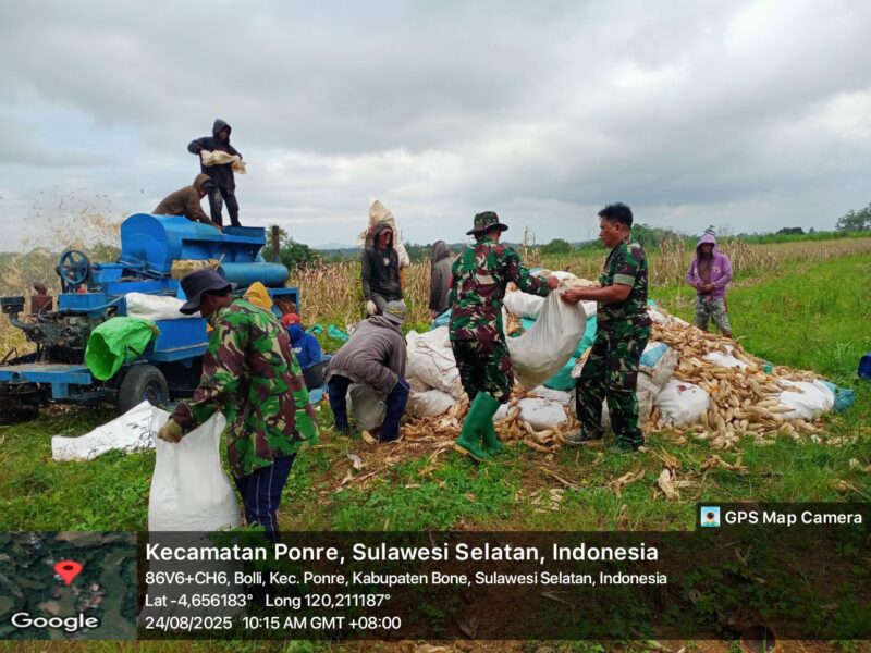 BONE – Dukung ketahanan pangan, Babinsa Koramil 1407-10/Ponre Serda Iwan setiawan membantu petani merontok jagung di wilayah binaan yang berlokasi di Desa Bolli, Kec. Ponre, Kab. Bone. Minggu Sore (24/08/2025).