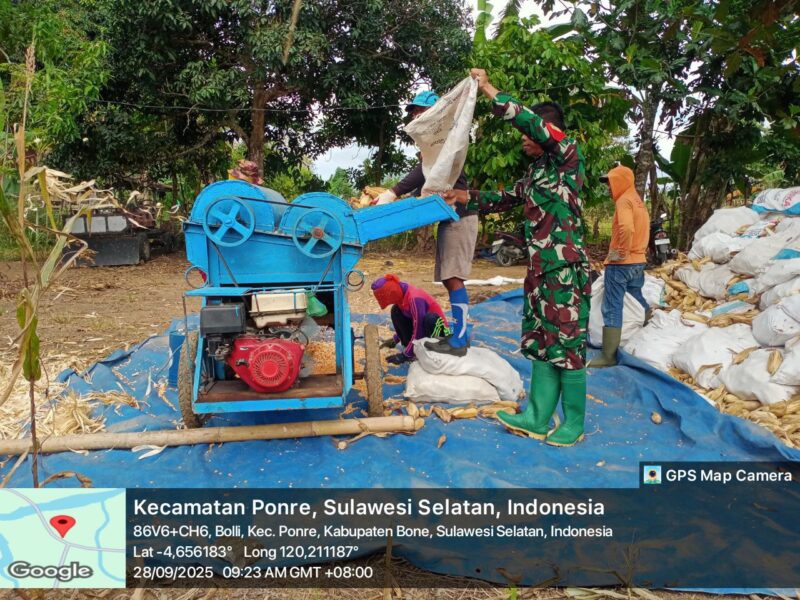 BONE – Babinsa Koramil 1407-10/Ponre Serda Iwan Setiawan melaksanakan pendampingan dan membantu warga binaanya dalam merontok jagung pasca panen yang berlokasi di Dusun Lawari, Desa Bolli, Kec. Ponre, Kab. Bone. Minggu siang (28/09/25)