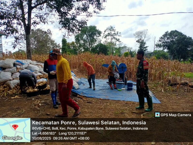 BONE – Untuk meningkatkan ketahanan pangan, Babinsa Koramil 1407-10/Ponre Serda Iwan Setiawan melaksanakan pendampingan dan membantu dalam merontokan jagung pasca panen warga binaanya yang berlokasi di Desa Bolli Kec. Ponre, Kab. Bone, Minggu (10/08/2025)
