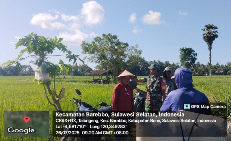 Bone – Babinsa Koramil 1407-11/Barebbo Serma Salama melaksanakan Komunikasi Sosial (Komsos) sekaligus memberikan motivasi kepada para petani padi di area persawahan Dusun Galung, Desa Talungeng, Kecamatan Barebbo, Kabupaten Bone. Minggu sore (27/07).