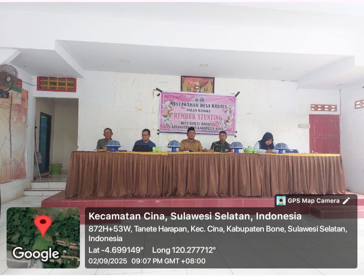 Turut hadir dalam kegiatan tersebut Kepala Desa Tanete Harapan, perwakilan dari Puskesmas Cina, BPD, kader posyandu, tokoh masyarakat, serta warga desa yang antusias mengikuti musyawarah.