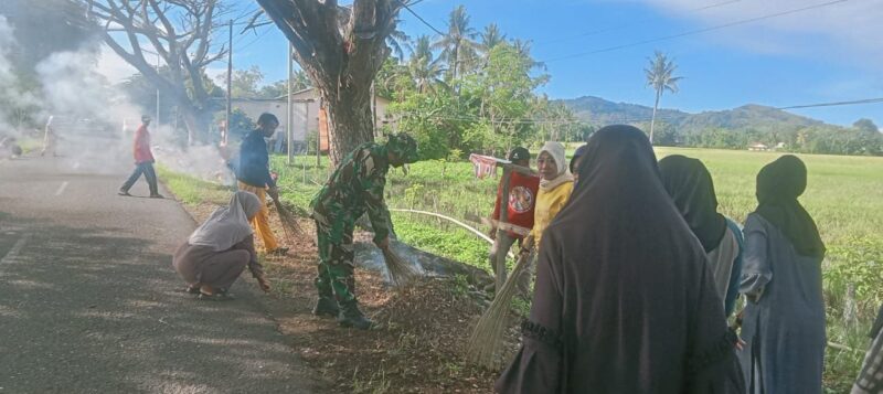 BONE – Babinsa Koramil 1407-13/Sibulue Serka Dwi Widodo bersama masyarakat setempat melaksanakan karya bakti membersihkan fasilitas umum di kiri dan kanan jalan di Kel. Maroanging, Kec. Sibulue, Kab. Bone. Selasa (11/11/25).
