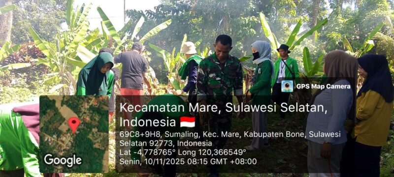 BONE – Babinsa Koramil 1407-15/Mare, Sertu La Muru, bersama aparat desa dan mahasiswa KKN IAIN Bone melaksanakan kegiatan pembersihan lahan di Kantor Desa Sumaling, Kecamatan Mare, Kabupaten Bone. Senin Siang (10/11/25).