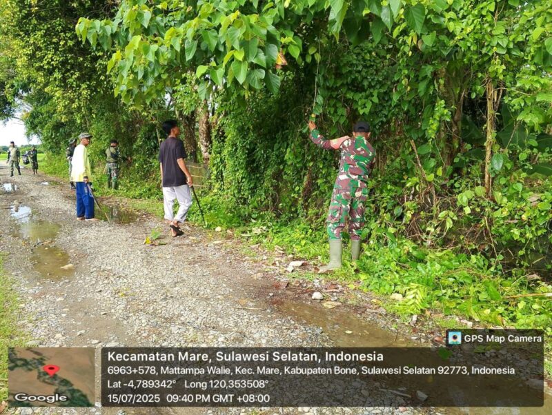 BONE – Babinsa Koramil 1407-15/Mare Serda Irpan bersama warga masyarakat melaksanakan gotong royong membersihkan rumput liar di sepanjang pinggir jalan Desa Mattampa Walie, Kecamatan Mare, Kabupaten Bone, Selasa (15/07/25).