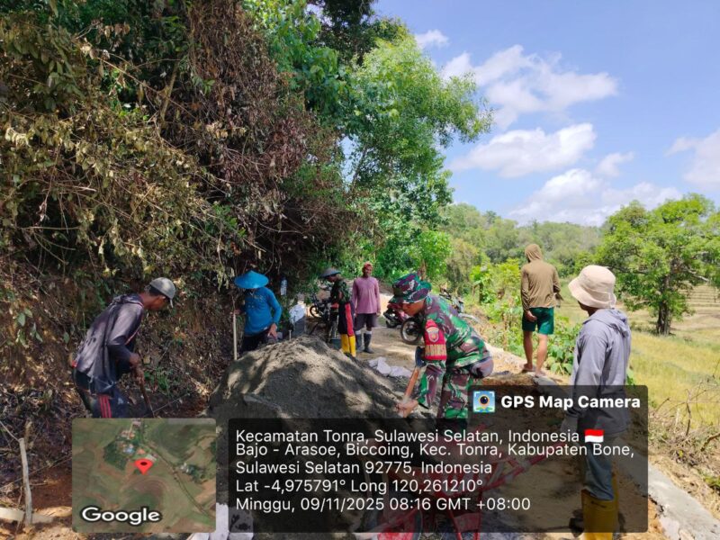 BONE – Babinsa Koramil 1407-16/Tonra Serda Mardianto melaksanakan kegiatan gotong royong bersama warga binaannya dalam pembangunan talud di Dusun Biccoing 1, Desa Biccoing, Kecamatan Tonra, Kabupaten Bone. Minggu Siang (09/11/25).