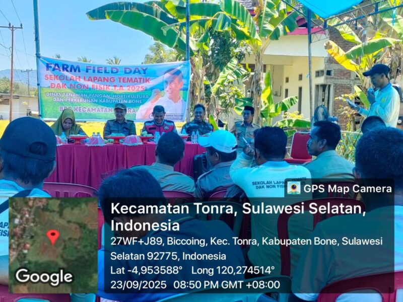 BONE – Babinsa Koramil 1407-16/Tonra Sertu Ansar Rajab hadiri Rapat Farm Field Day Sekolah Lapangan Tematik Dana Alokasi Khusus (DAK) Non Fisik Tahun 2025, yang diselenggarakan oleh Dinas Tanaman Pangan, Hortikultura dan Perkebunan Kabupaten Bone, bertempat di Desa Gareccing, Kec. Tonra, Kab. Bone. Selasa siang (23/09/25).