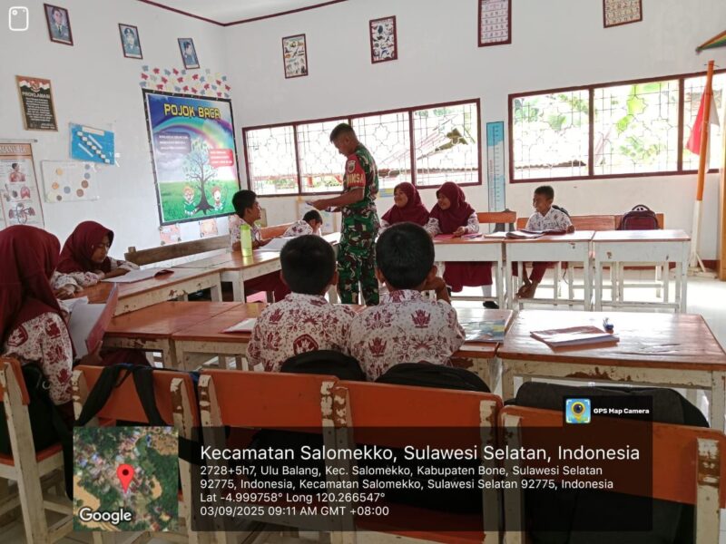 BONE – Dalam upaya meningkatkan kualitas pendidikan dasar, Babinsa Koramil 1407-17/Salomekko Sertu Suardi turut membantu proses belajar mengajar di SD 255 Desa Ulubalang, Kecamatan Salomekko, Kabupaten Bone. Rabu (03/09/25).
