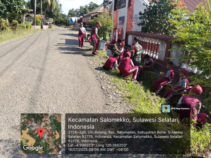 Bone — Dalam rangka menanamkan semangat kebersamaan dan kepedulian terhadap lingkungan sejak dini, Babinsa Koramil 1407-17/Salomekko, Serda Ferdy, bersama para guru dan siswa Sekolah Dasar (SD) 225 Ulubalang, Desa Ulubalang, Kecamatan Salomekko, Kabupaten Bone, menggelar aksi gotong royong membersihkan parit di lingkungan sekolah. Sabtu (19/07/2025)
