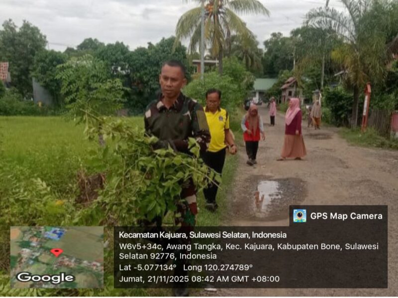 BONE – Babinsa Koramil 1407-18/Kajuara, Serka Kamaruddin, melaksanakan kegiatan karya bakti pembersihan lingkungan bersama warga Kelurahan Awangtangka, Kecamatan Kajuara, Kabupaten Bone. Jumat Siang (21/11/25).